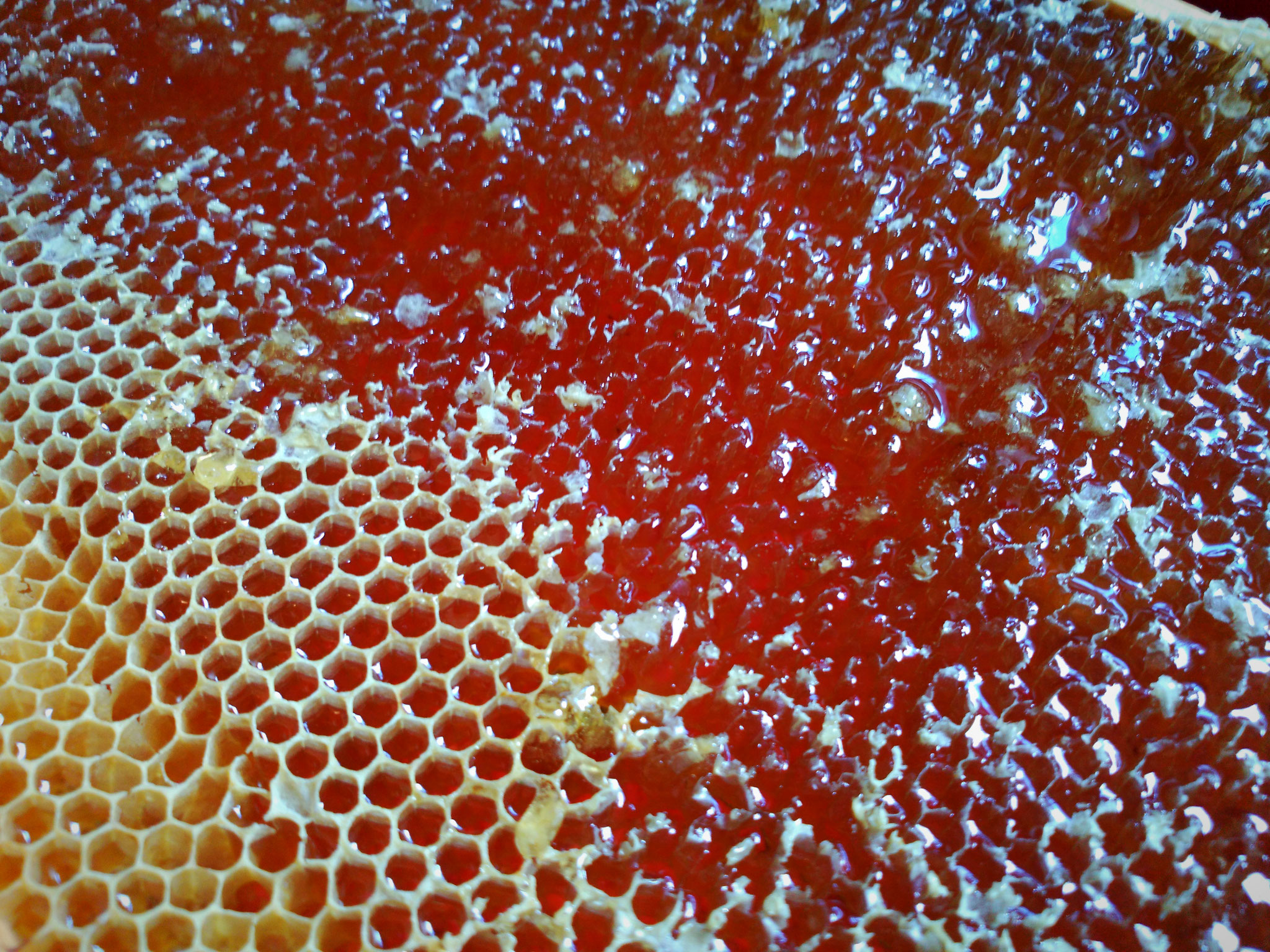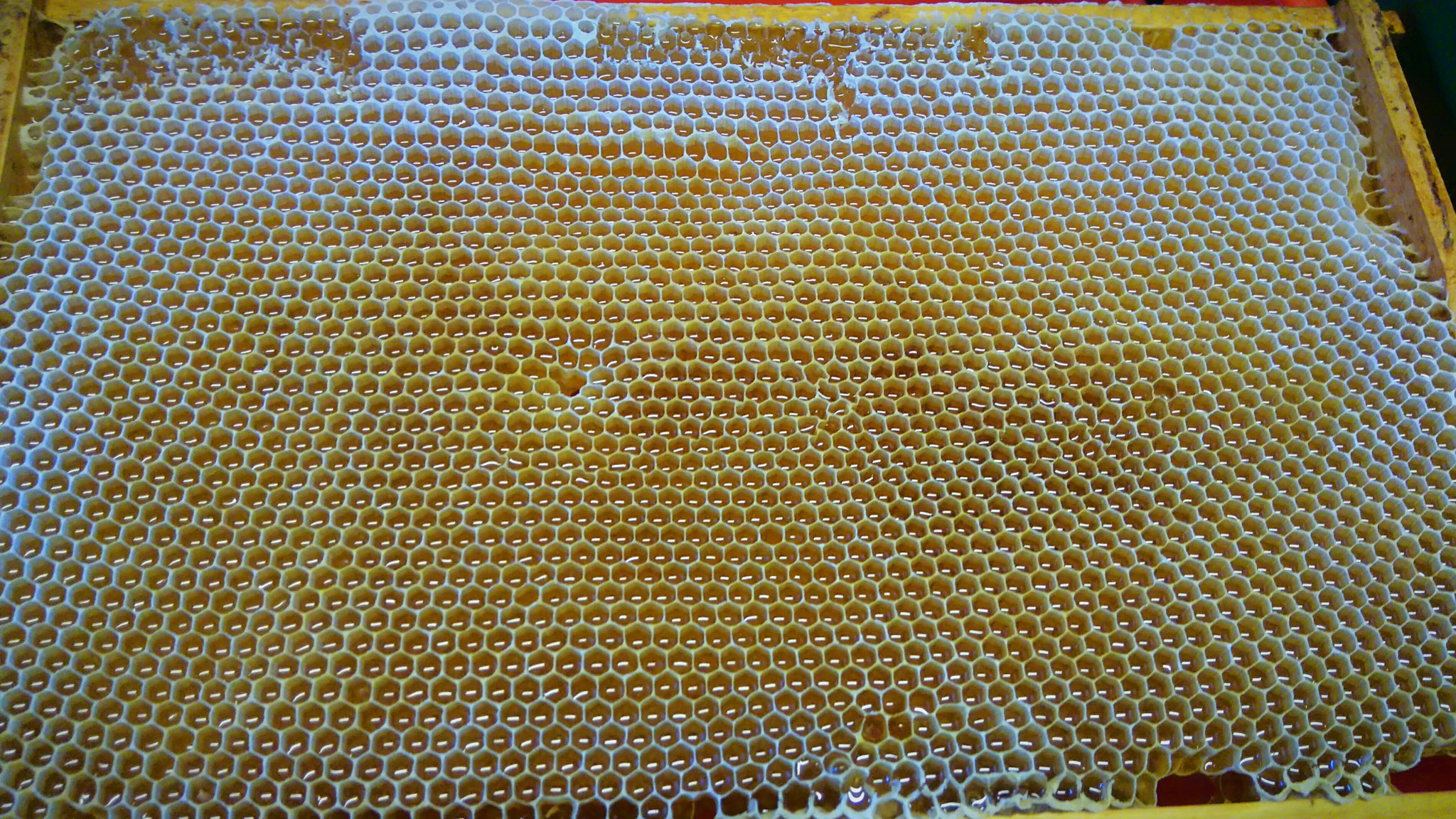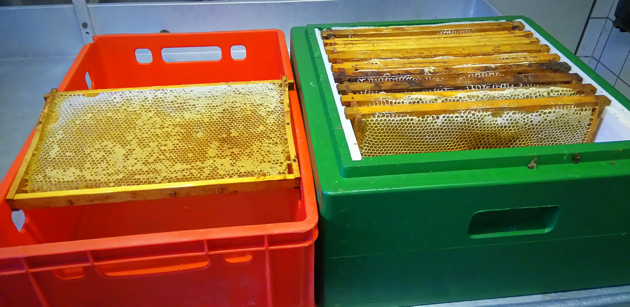 Die Honigernte ist die spannendste Zeit im Bienenjahr und jedes Jahr das Highlight in der Imkerei. Die Bienen sammeln Nektar und Pollen aus einem Umkreis von bis zu 2 Km Entfernung und tragen diese in den Bienenstock ein. Der Bienenstock selber besteht aus der Zarge (Kiste) und den Waben. Der Nektar wird in Waben eingelagert. Dem Nektar wird durch die Bienen Wasser entzogen, um ihn haltbar zu machen. Ist der Wassergehalt des Nektars auf unter 20 % gesunken spricht man von Honig. Die mit Honig gefüllten Waben werden dem Bienenvolk entnommen sobald dieser reif ist. Durch das Schleudern des Honigs wird dieser aus den Waben geschleudert. Das Schleudern wird in unserer Imkerei von Hand durchgeführt und ohne den Honig dabei zu erhitzen.