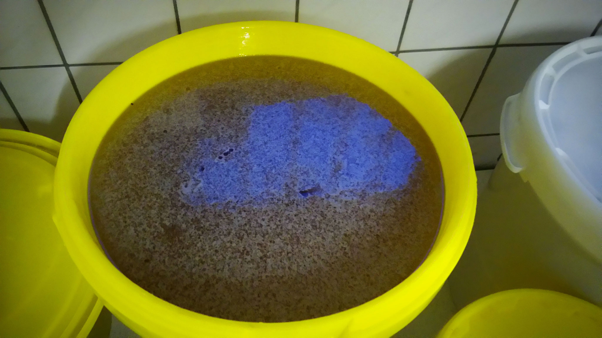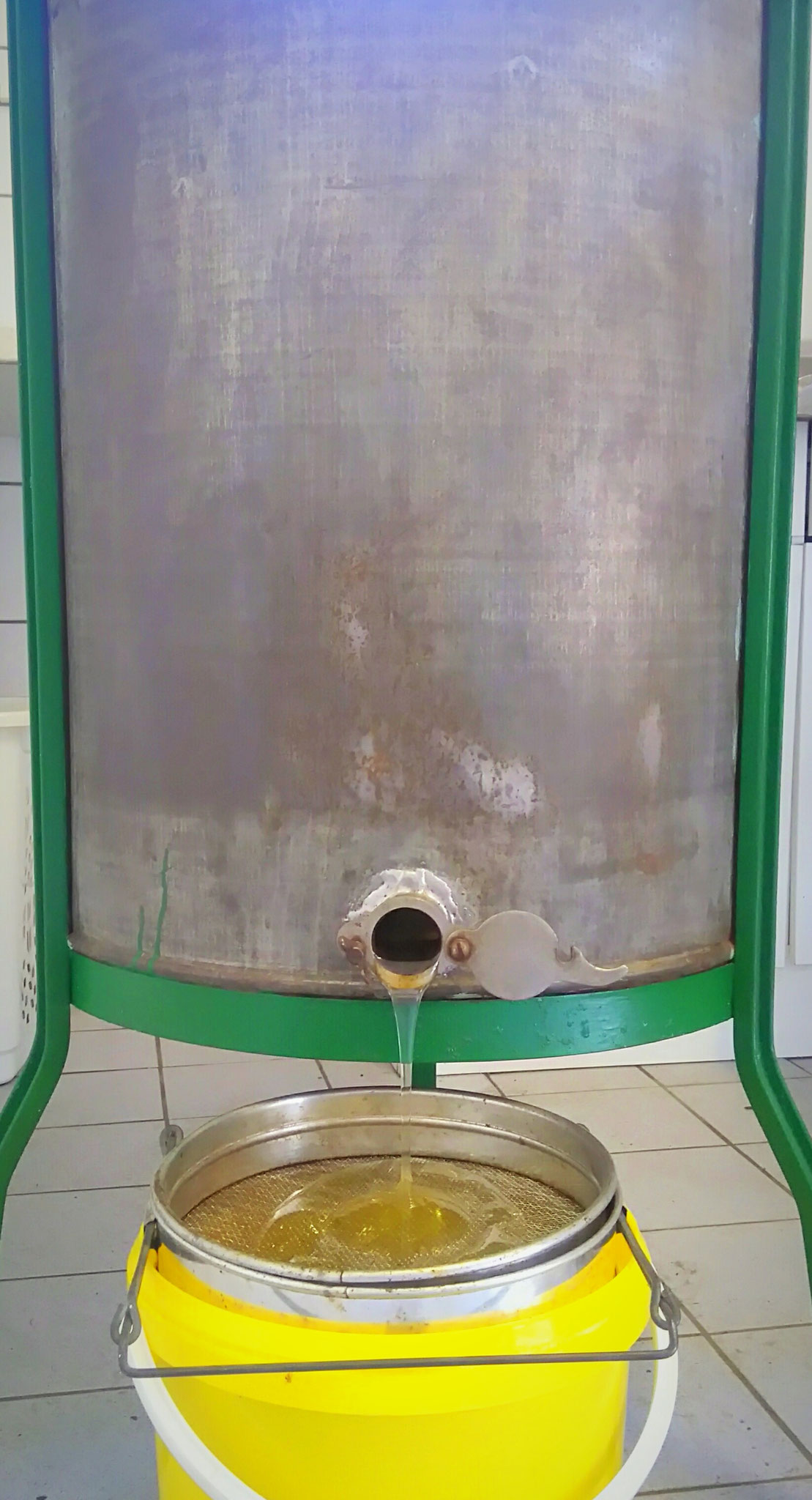 Nach dem Abfüllen des Honigs in Eimer muss dieser noch gerührt werden. Der Honig ist während der Ernte flüssig und meist gold-gelb. Diesen Zustand behalten die meisten Honige jedoch nur einige Zeit lang. Jeder Honig kristallisiert früher oder später, d.h. er wird fest und ändert seine Konsistenz. Das Rühren des Honigs während der Kristallisation macht den Honig fein cremig und streichfähig. Würde der Honig im Glas kristallisieren, würde er sehr fest und u.U. grob-körnig werden. Nach dem Rühren des Honigs hat er die richtige Konsistenz und kann in die 500g-Imkerbund Gläser abgefüllt werden.